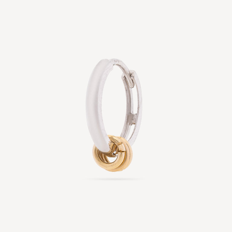 This 14-carat white gold Hoop from Diane M features three yellow gold rings, creating an elegant, modern contrast. This sophisticated design combines the purity of white gold with the warmth of yellow gold, offering a versatile piece of jewelry.