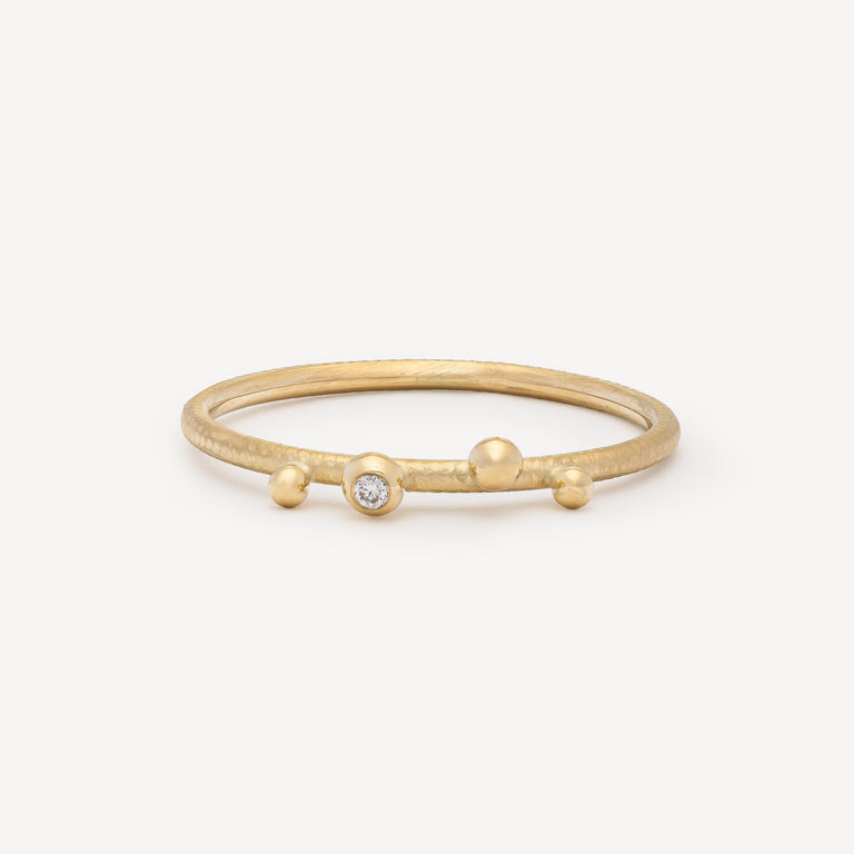 The Delphis ring is light and elegant, making it feminine and classic. The goldsmiths have hand-filtered the surface, creating a contrast with the small, thin ball that rises in high gloss to reflect the light. It comes in five variants that can be freely assembled - or worn on their own.
