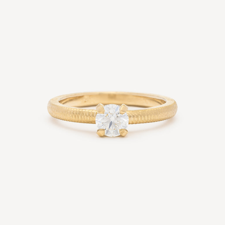 This classic solitaire ring is set with an exquisite 0.50 ct. claw-set diamond. The outside of the ring features a fluted, hand-profiled surface, while the inside of the band and setting are polished.