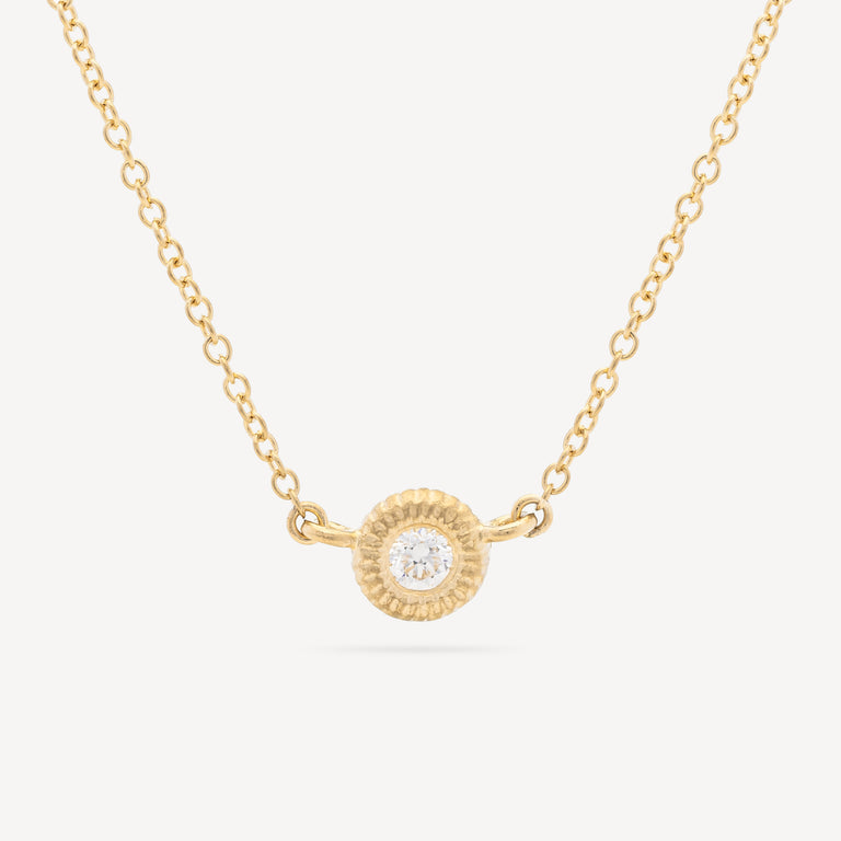 The Glory necklace features a diamond set in gold and surrounded by a hand-crafted circle that enhances the natural brilliance of the stones. The result is a unique necklace with a timeless design, handed down from generation to generation.