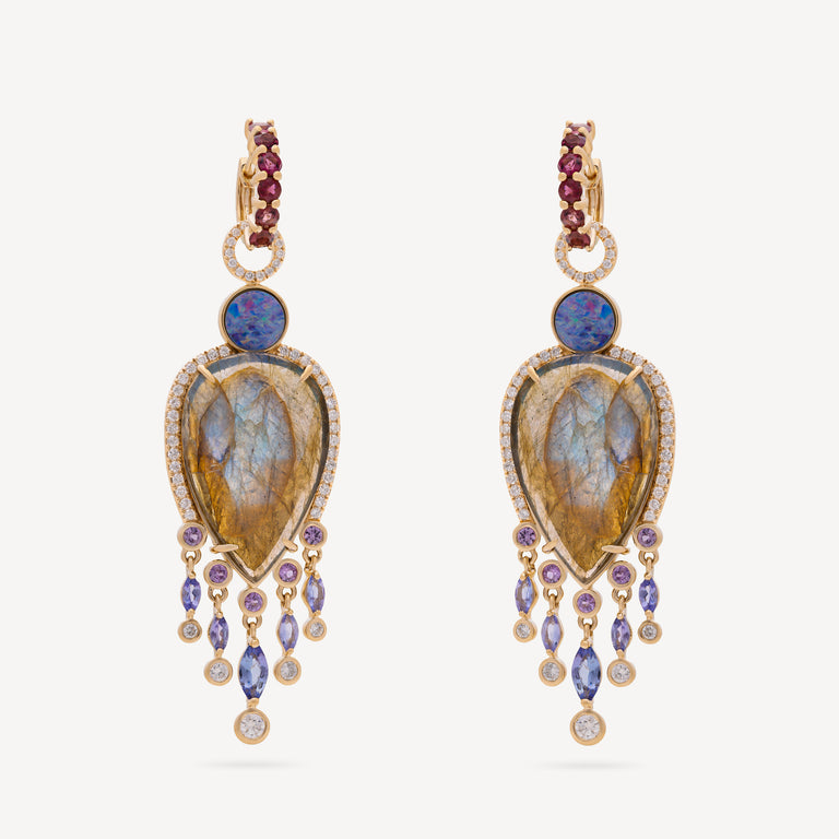 Magnificent pair of yellow gold earrings featuring a central labradorite surrounded by white diamonds and a boulder opal and adorned with diamonds, tanzanites and dangling pink sapphires. All mounted on pink sapphire-paved hoop earrings.