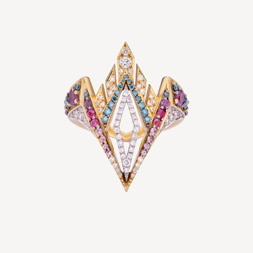 - Materials: Yellow gold, White diamond, Multicolored sapphire, Amethyst