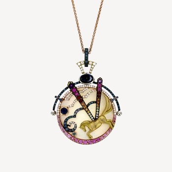 - Materials: Yellow gold, white diamond, amethyst, blue sapphire