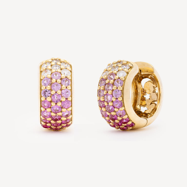 This pair of hoop earrings is crafted in yellow gold and half-paved with pink gradient diamonds.