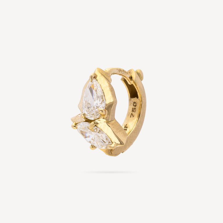 Handcrafted in 18-carat gold, it features a marquise and a pear-shaped diamond mounted on a fine Hoop with a sharp edge, for a delicate and secure wear on the ear.