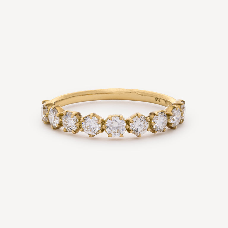 This magnificent ring features nine round brilliant diamonds, set in six claws on a matte-finish gold band. Its comfortable, modern design is distinguished by Jade Trau's signature sharp-edge technique.