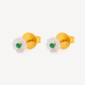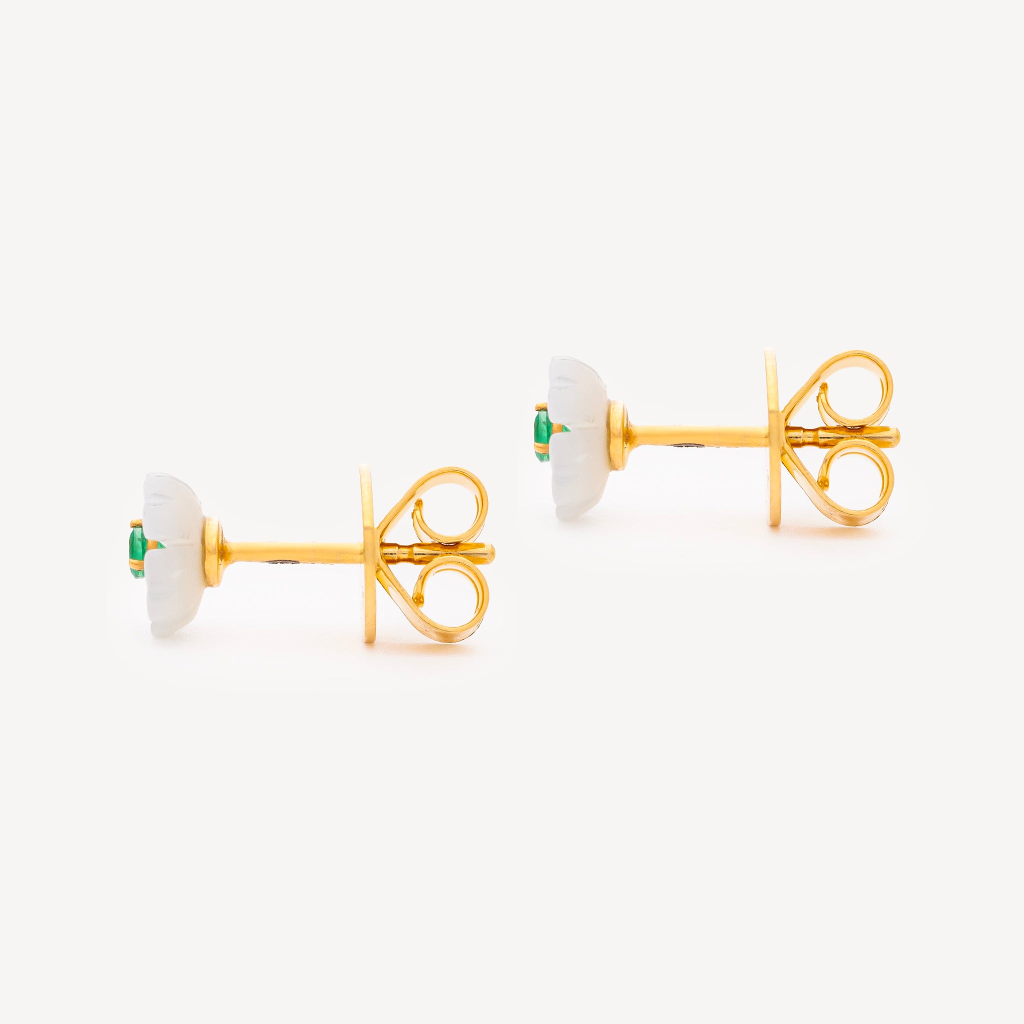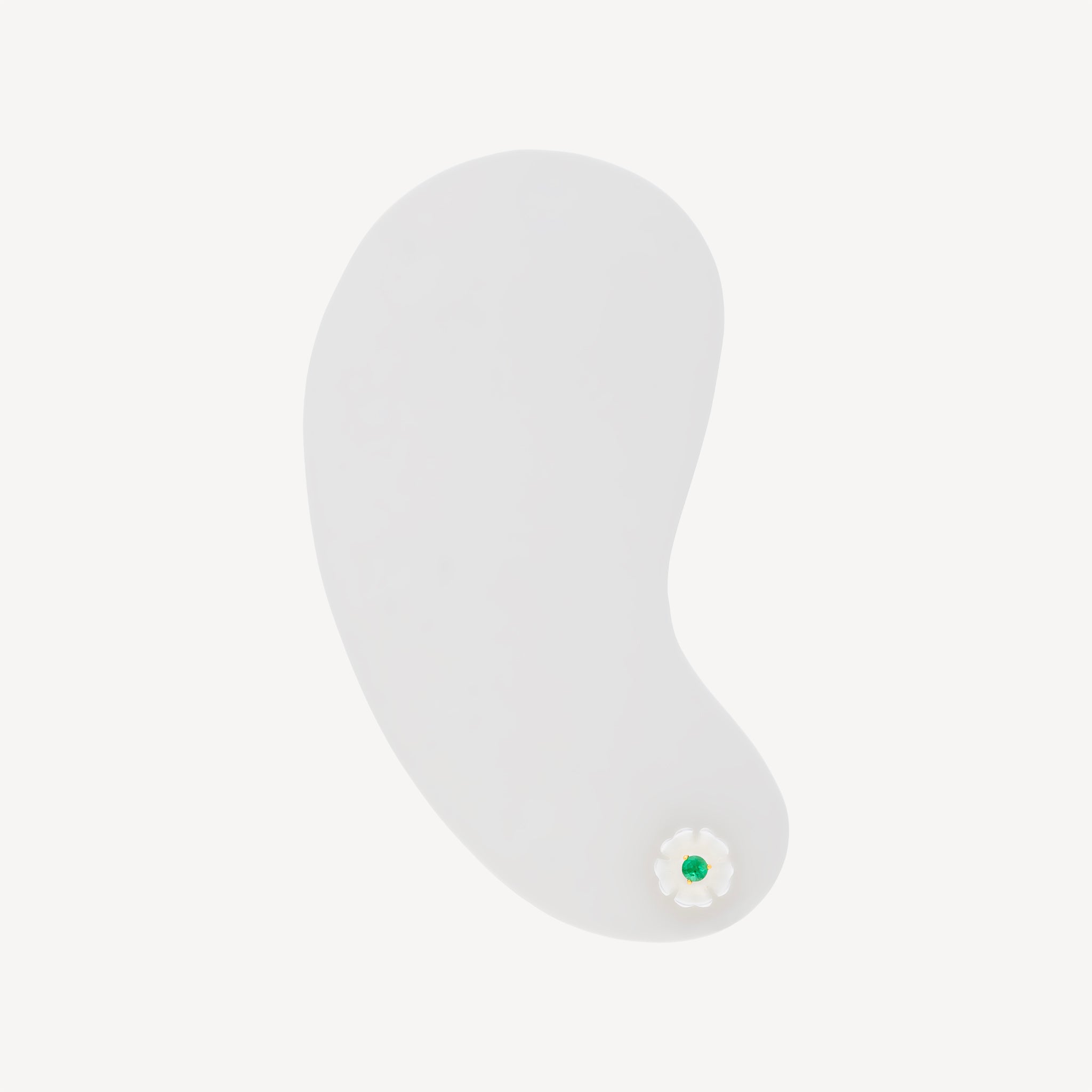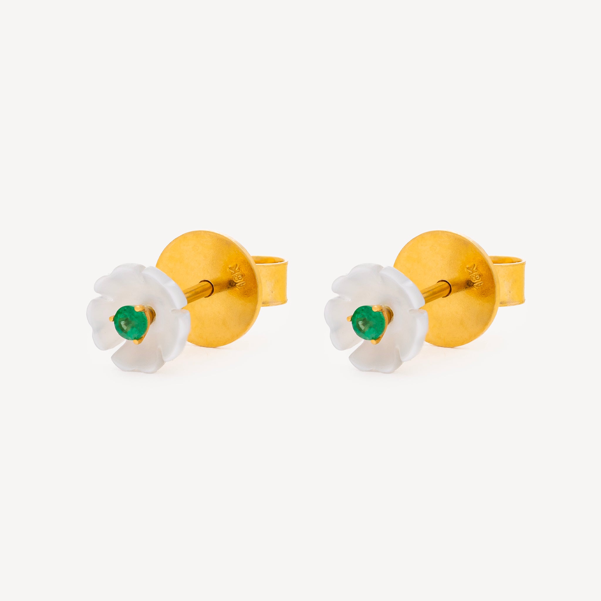 This pair of Mother of Pearl Emerald Daisy earrings by Khepri is crafted in yellow gold. It features a small mother-of-pearl flower, sublimated by a central emerald. Mother-of-pearl is an ally of softness and protection, while emerald is a stone of harmony and renewal, reputed to soothe the emotions.