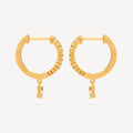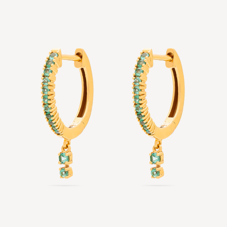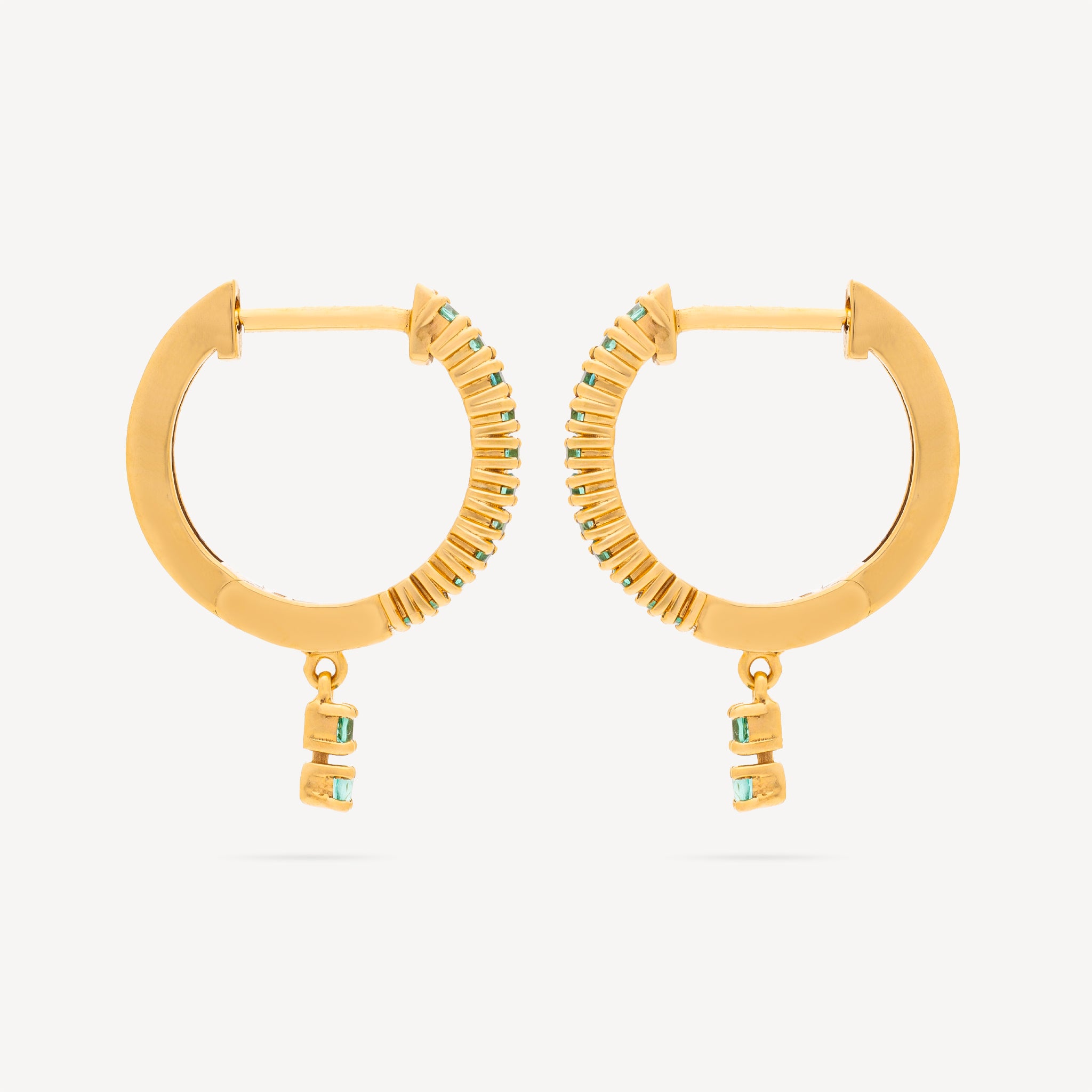 This pair of Emerald Petite Double Drip earrings by Khepri is crafted in yellow gold. It features an emerald-set Hoop , embellished by two dangling emeralds in a closed setting. Emerald is a stone of harmony and renewal, reputed to soothe the emotions.