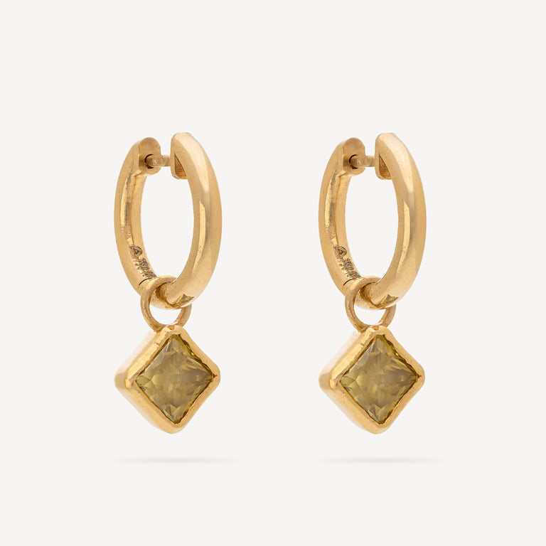 Yellow gold hoop earrings with pendant set with a green princess diamond.
