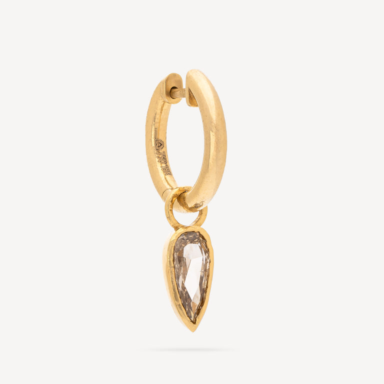 Hoop in yellow gold set with a cloisonné-set cognac pear diamond pendant.
