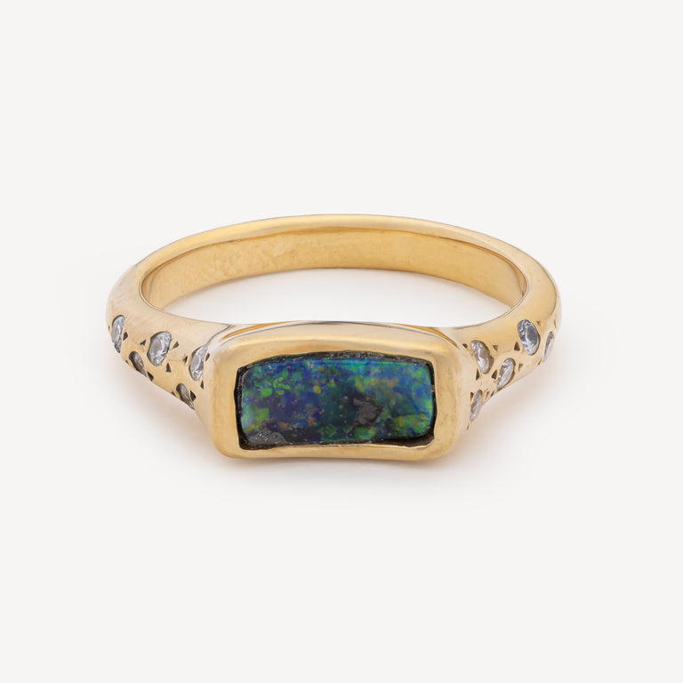 This elegant yellow gold ring features a rectangular opal with enchanting reflections, surrounded by white diamonds for a touch of light and refinement.