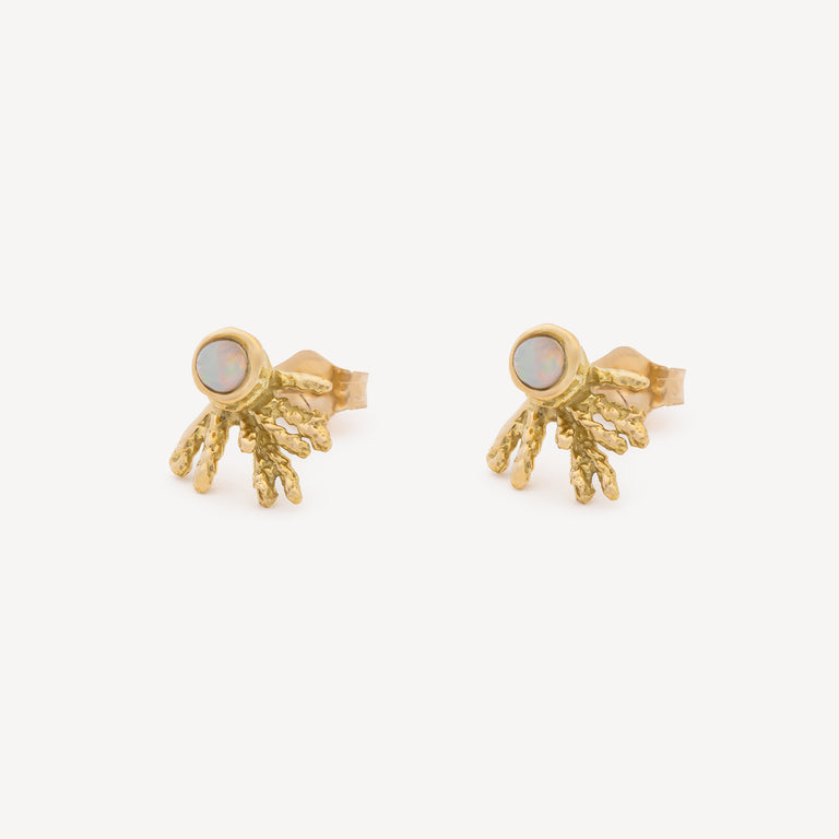 Elegant and timeless, these stud earrings in 18-carat gold feature delicate opal stones with iridescent reflections.