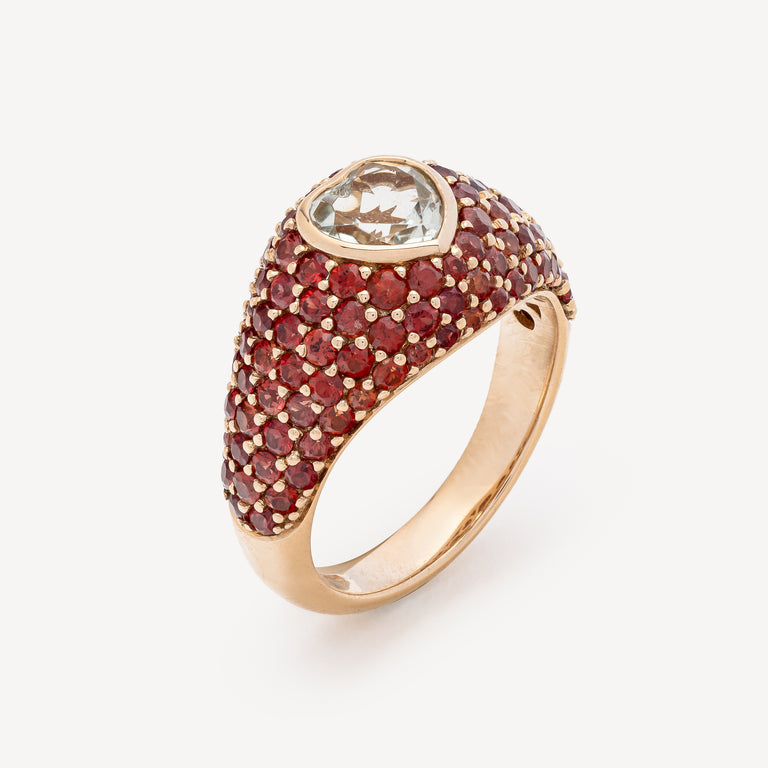 This 18-carat gold signet ring is the perfect blend of sophistication and originality. Its heart-shaped prasiolite center and pavé-cut orange sapphires will add a touch of elegance and color to any look.