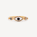 Yellow gold ring featuring a central enamel eye and two surrounding sapphires.