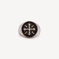 Silver signet ring decorated with a cross set with white diamonds.