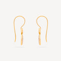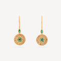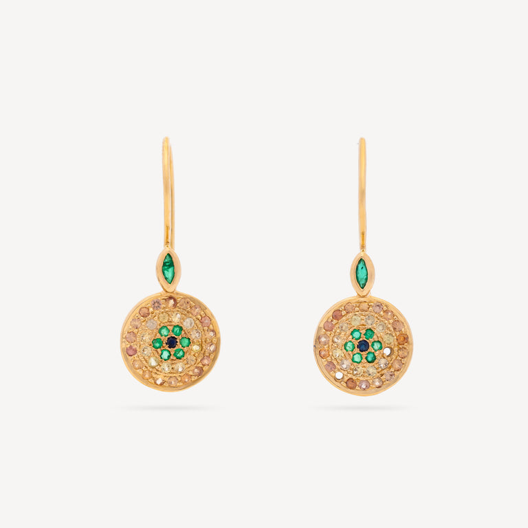 Yellow gold earrings with disc set with emeralds, blue sapphires, cognac sapphires and yellow sapphires. Two stones are missing from the right earring.