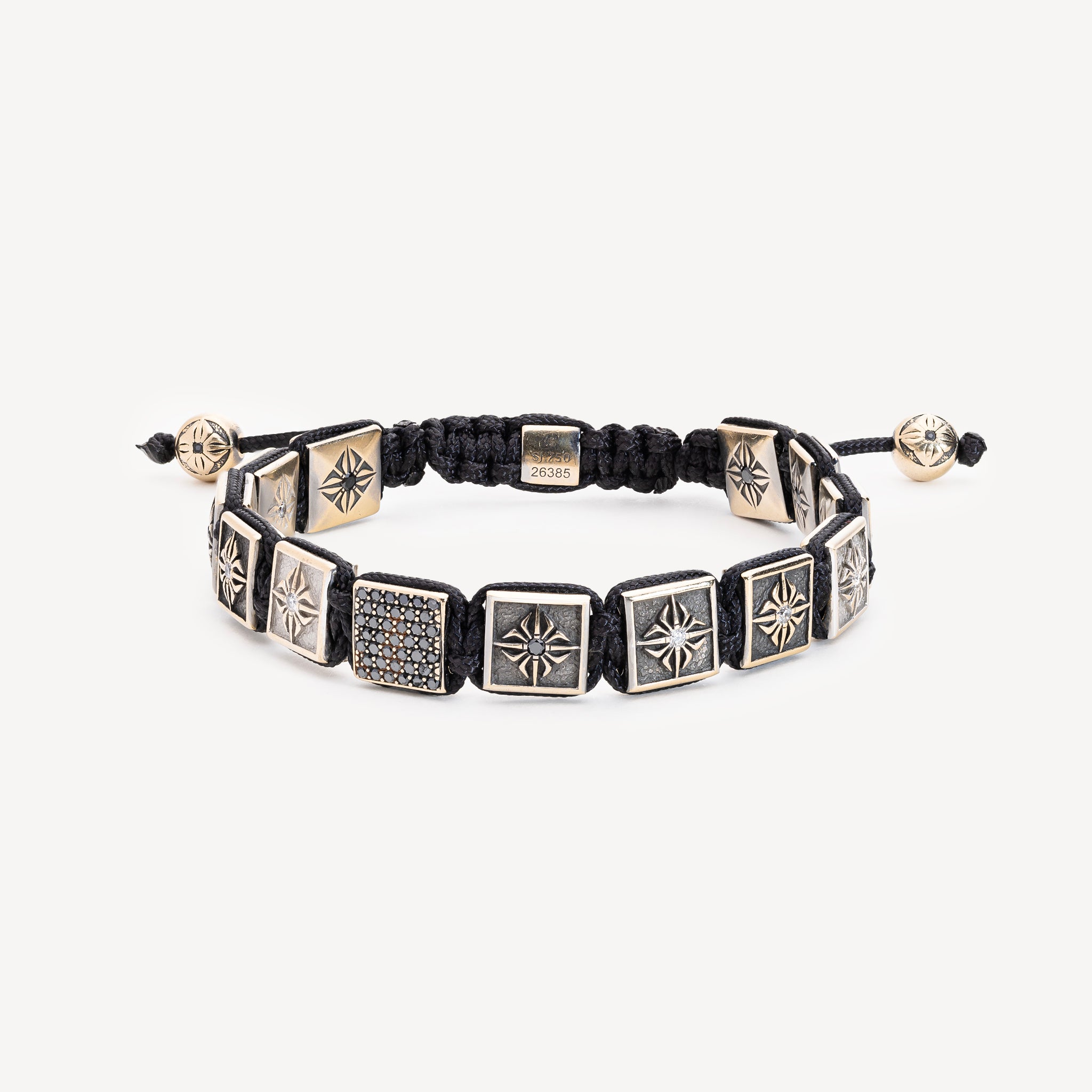 Bracelet mounted on a black cord composed of : 1 black gold lock set with black diamonds, 2 black gold beads set with black diamonds, 4 black gold locks set with white diamonds, 6 black gold locks set with black diamonds, 2 white gold locks set with white diamonds, 1 black gold lock clasp set with a white diamond.