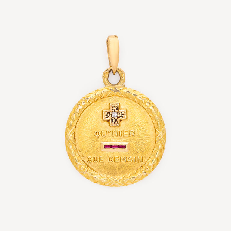 Médaille d’amour en or jaune ornée de l’inscription “+ qu’hier - mois que demain” et entourée d’une couronne d’épis en or. Le+ est serti de diamants blancs et le - de rubis.