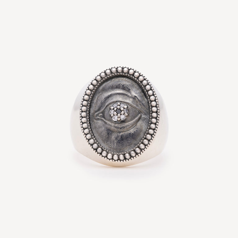 The Lover's Eye ring combines fascinating synthetic diamonds with an enigmatic black diamond to symbolize love, sadness and honesty. The black diamond symbolizes strength, courage and resilience.