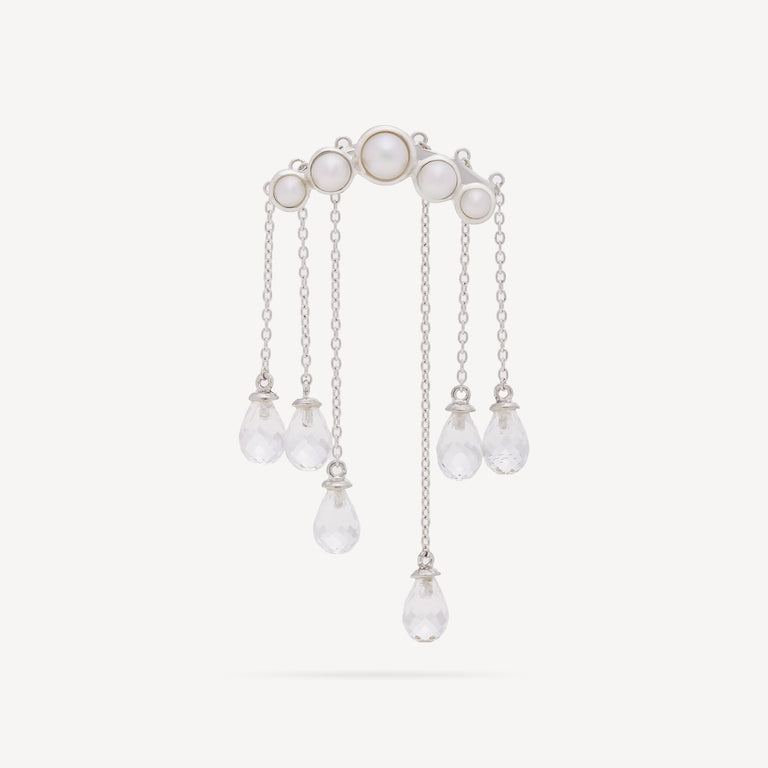 La boucle d'oreille Rain en argent représente la beauté délicate des gouttes de pluie tombant gracieusement du ciel. Le quartz est considéré comme une pierre d’énergie amplifiant les vibrations et favorisant l’équilibre intérieur. Les perles d’eau douce sont associées à la pureté et à l’harmonie émotionnelle, favorisant la sérénité.