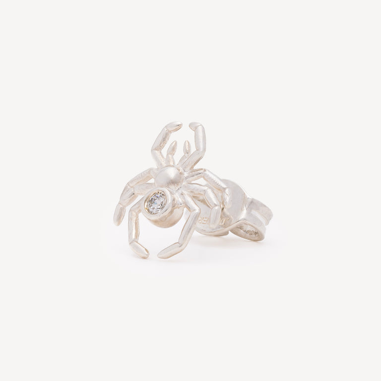The Spider earring embodies the resilience and artistry of the spider. This piece is a totem symbolizing courage, growth and transformation. The white diamond symbolizes purity and clarity, amplifying spiritual energy.