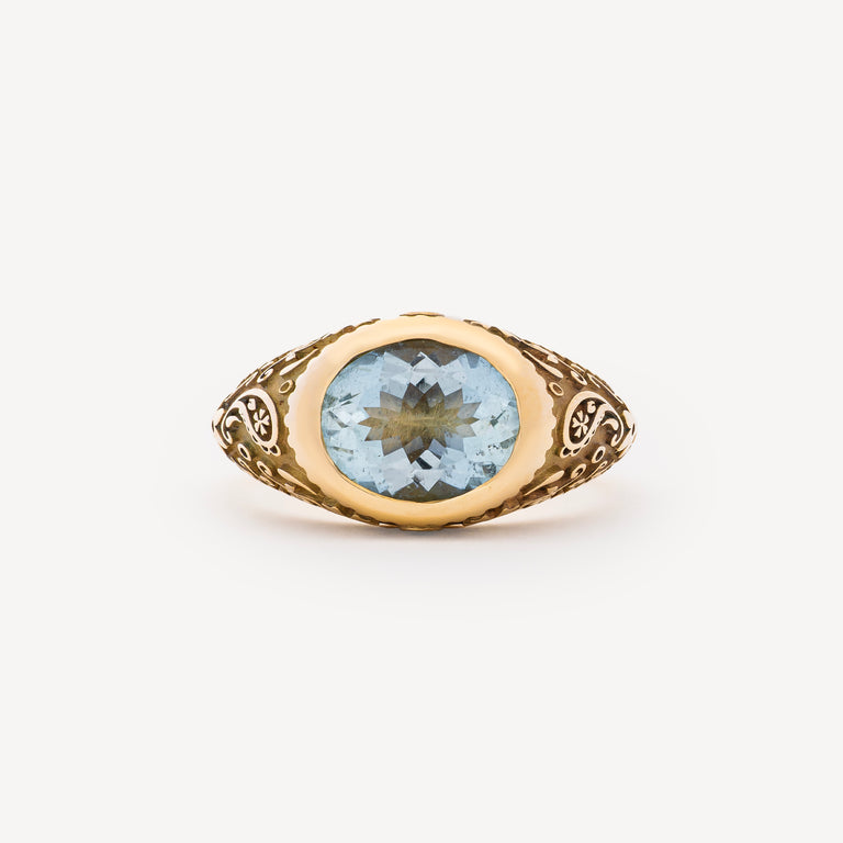 The Southwestern Signet Aigue Marine ring is an elegant and chic piece of jewelry. Made of yellow gold, it features a magnificent central aquamarine surrounded by sparkling white diamonds.