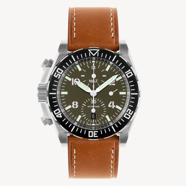 44mm diameter - 316L steel case - 2.8mm thick scratch-resistant anti-reflective sapphire crystal - Water-resistant to 200 metres - Screw-down crown, push-pieces and case-back - Olive green dial - Super Luminova C3 hour-markers and hands - Swiss automatic movement - Valjoux 7750