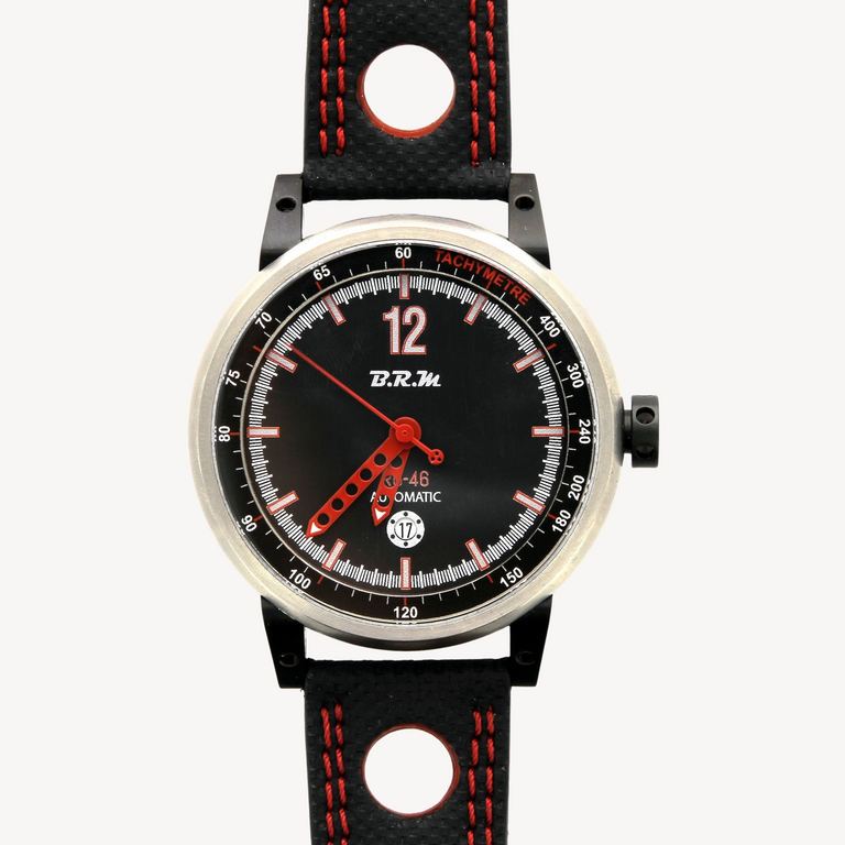 Valjoux 7753 automatic movement, diameter 46mm. Grey titanium case. Black PVD stainless steel horns and crown. Sapphire crystal top, bottom and bezel. Black dial, black tachometer with white writing. Red super-light hands. Special stainless steel screws. Technical fabric strap with holes and red double stitching. Water-resistant to 100 meters.