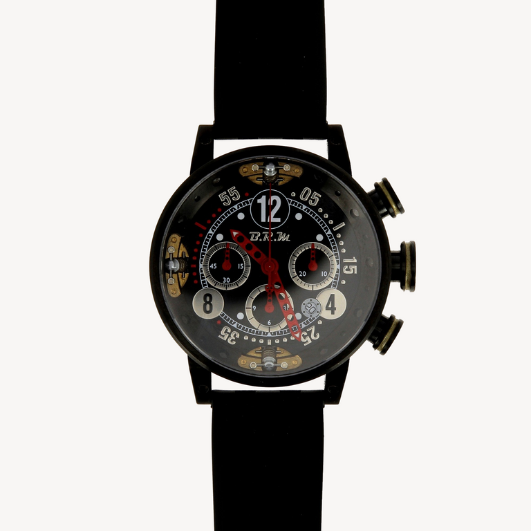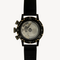 Valjoux 7753 automatic chronograph movement, diameter 46mm. Bronze case, black PVD stainless steel back and bezel. 5N color springs. Black PVD lacquered 5N crown and pushers. Black PVD stainless steel lugs. Sapphire crystal top and bottom (caseback and bezel). Black dial, grey appliques. Red super-light lightened hands. Stainless steel screws. Black rubber strap. Water-resistant to 100m.