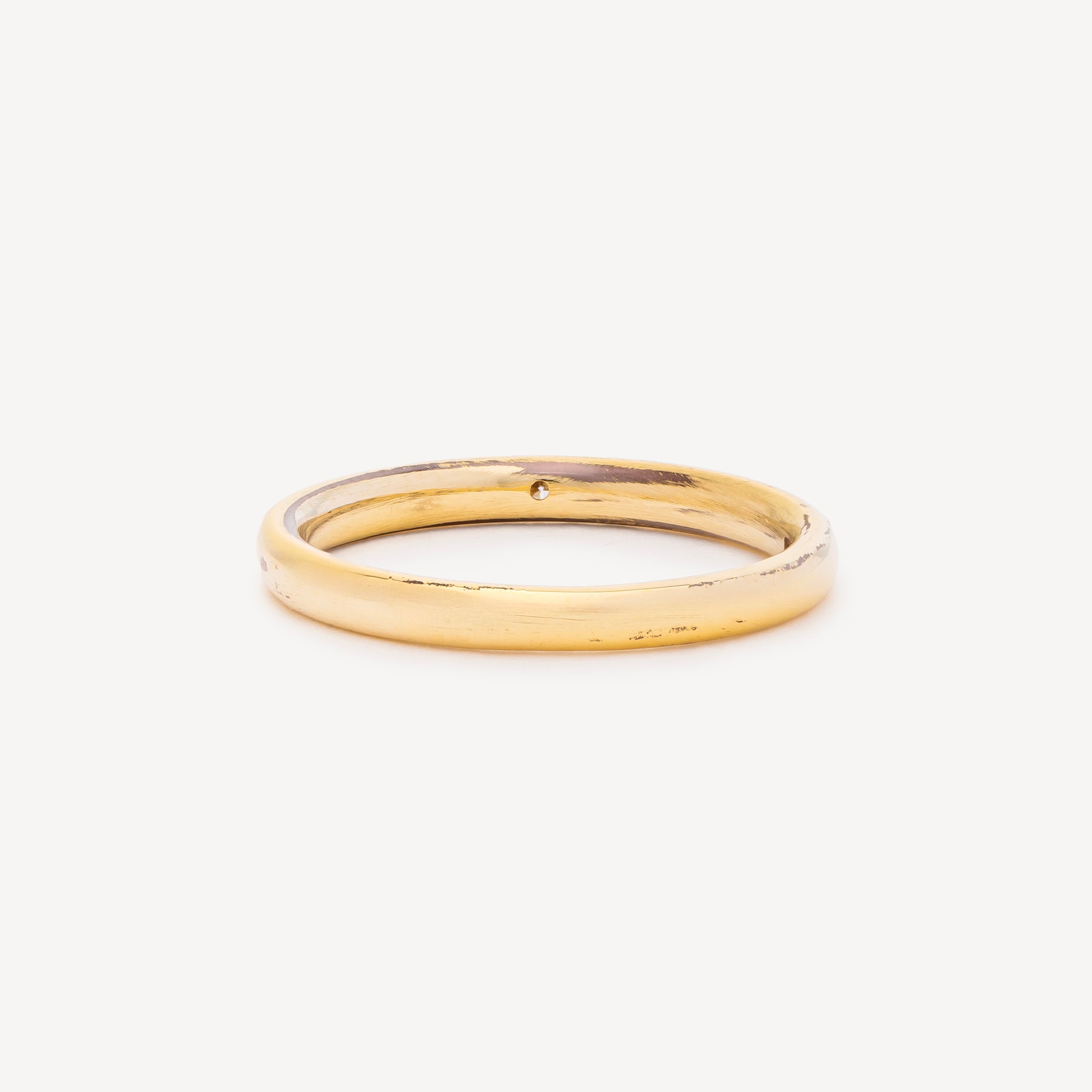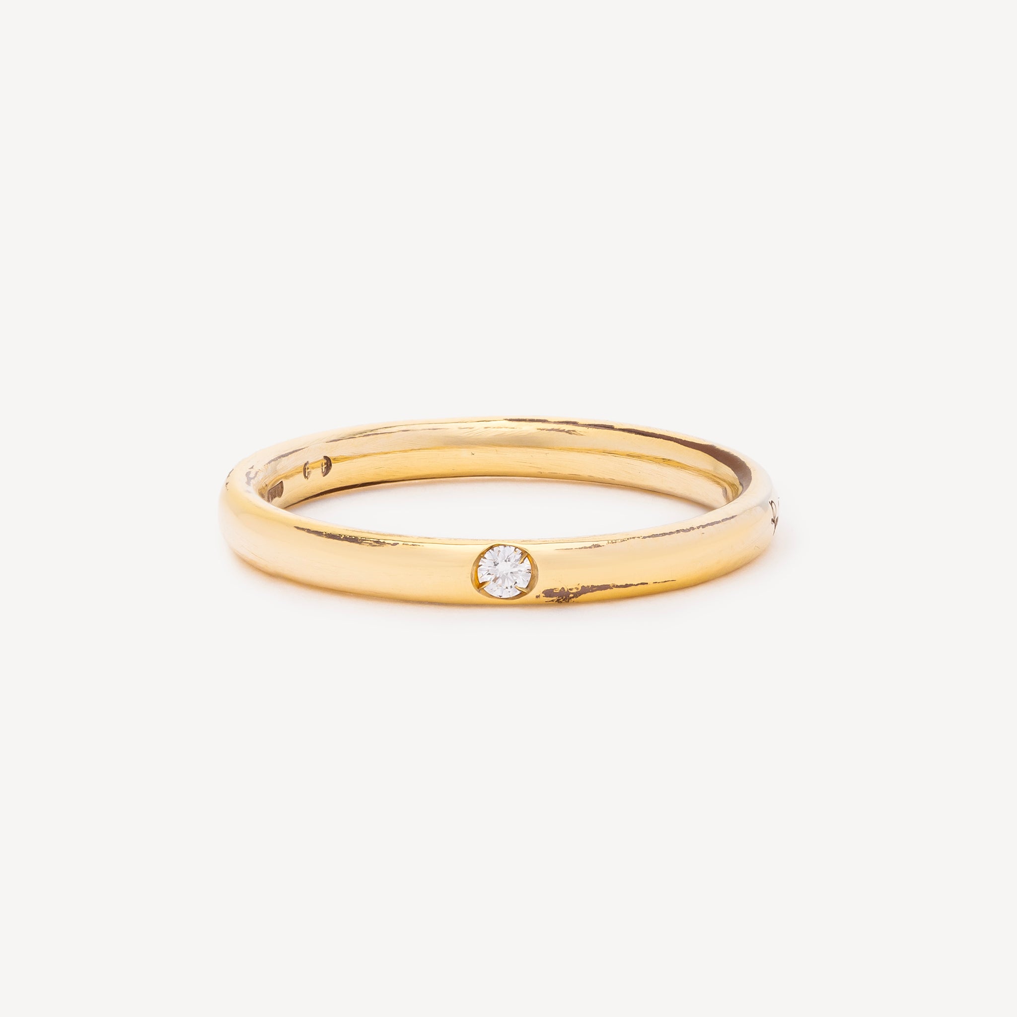 Bague Lucciole signée Pomellato offrant un design épuré composé d’un anneau en or jaune comportant en son centre un diamant blanc, symbolisant la force et la clarté de l’esprit.