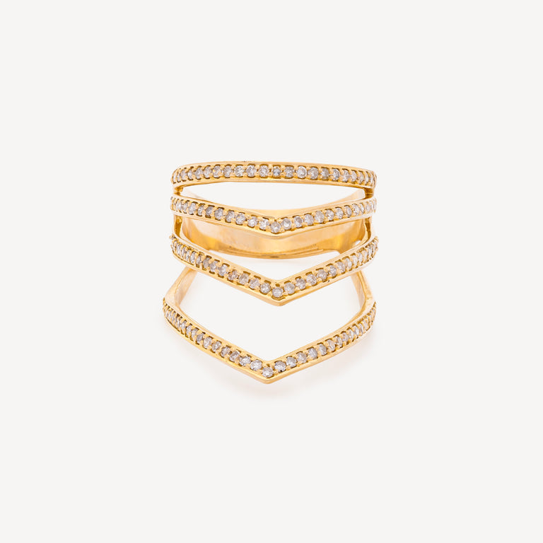 Bague en or jaune 14ct pavée de diamants blancs. Symbole de pureté et de force, le diamant blanc illumine l’esprit et amplifie les énergies positives.