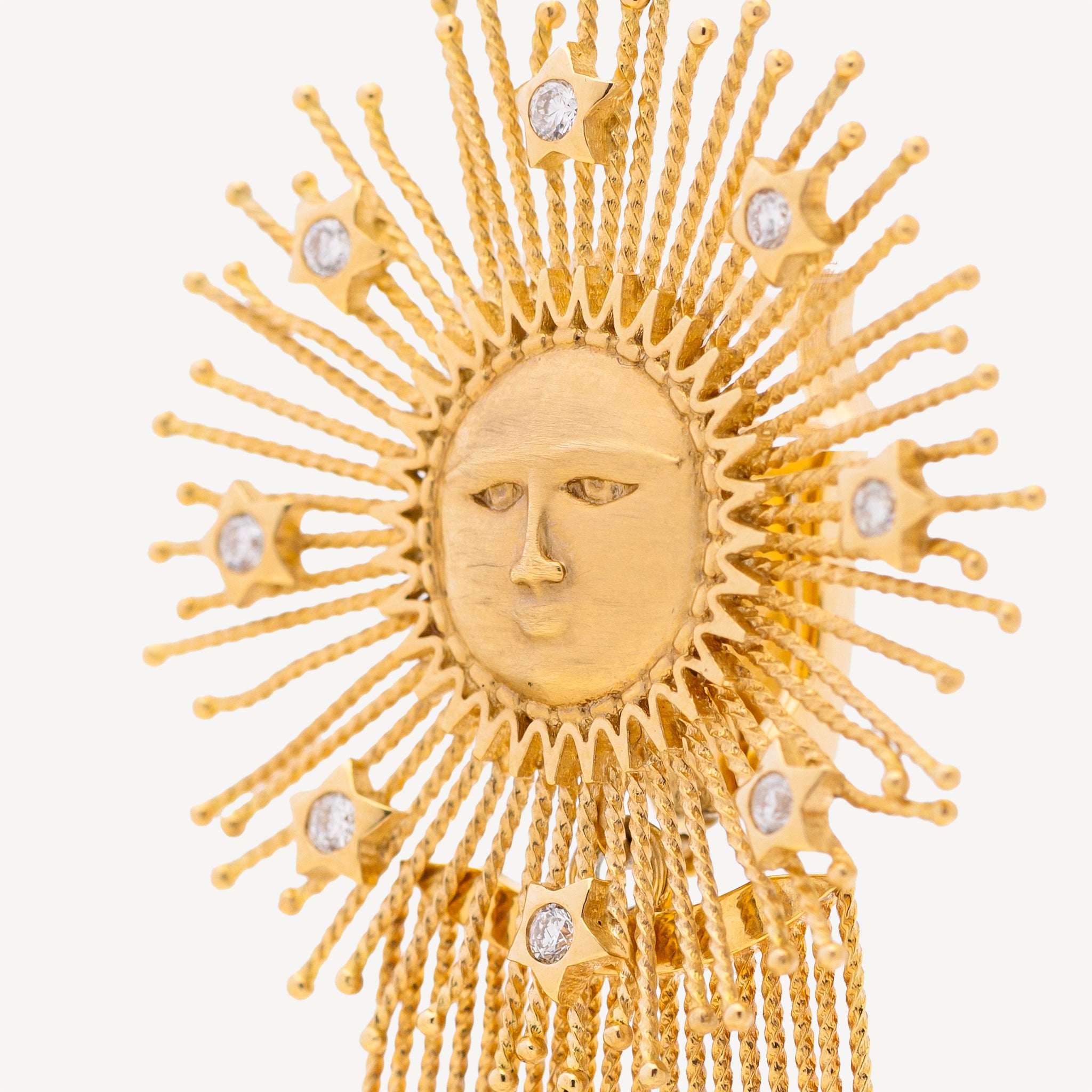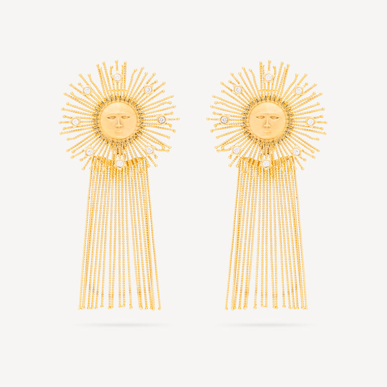 Les boucles d'oreilles Sunshine Tassel Rays, création poétique de Silvia Furmanovich, incarnent la radiance solaire. Composées d'un soleil central orné de diamants blancs, elles se prolongent par des pampilles en or jaune qui captent et diffusent la lumière comme des rayons descendant. Le diamant amplifi la force spirituelle tandis que l'énergie du soleil ravive la vitalité, la confiance et l'illumination intérieure.