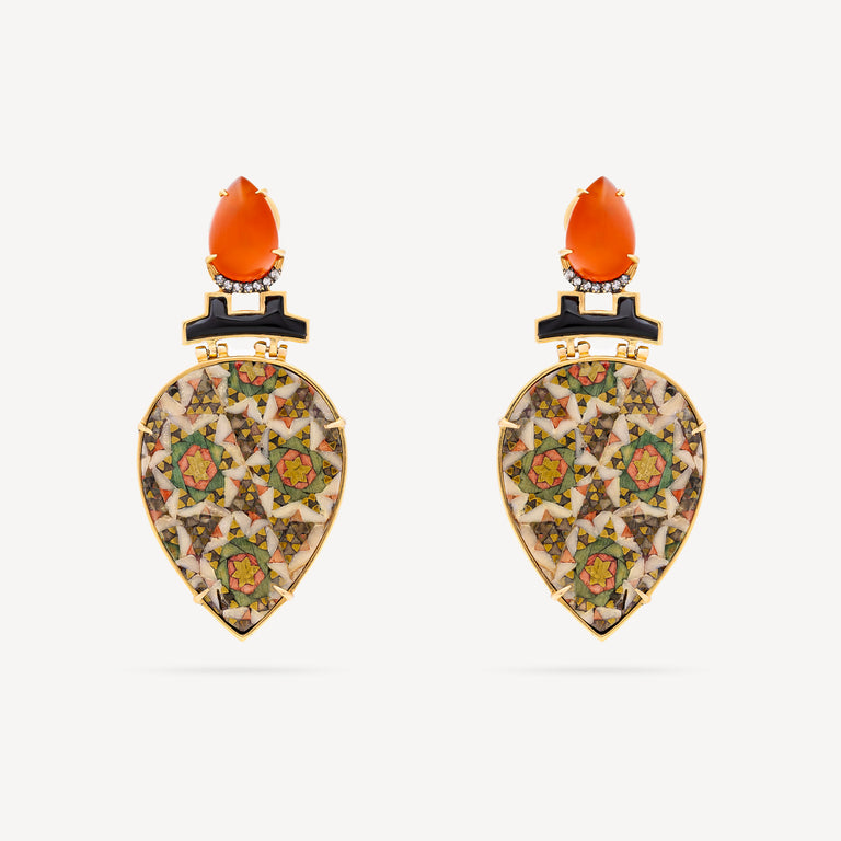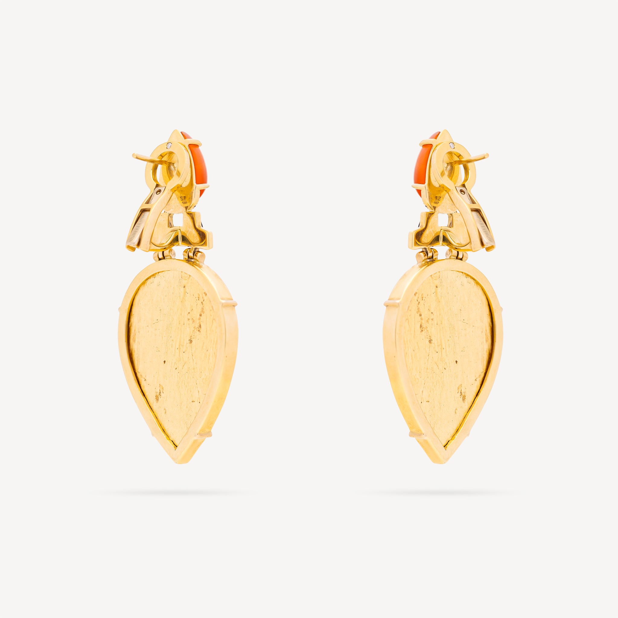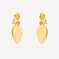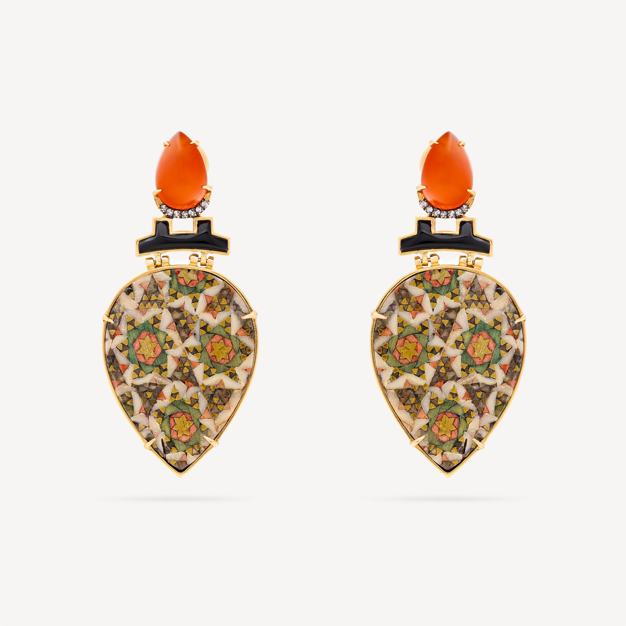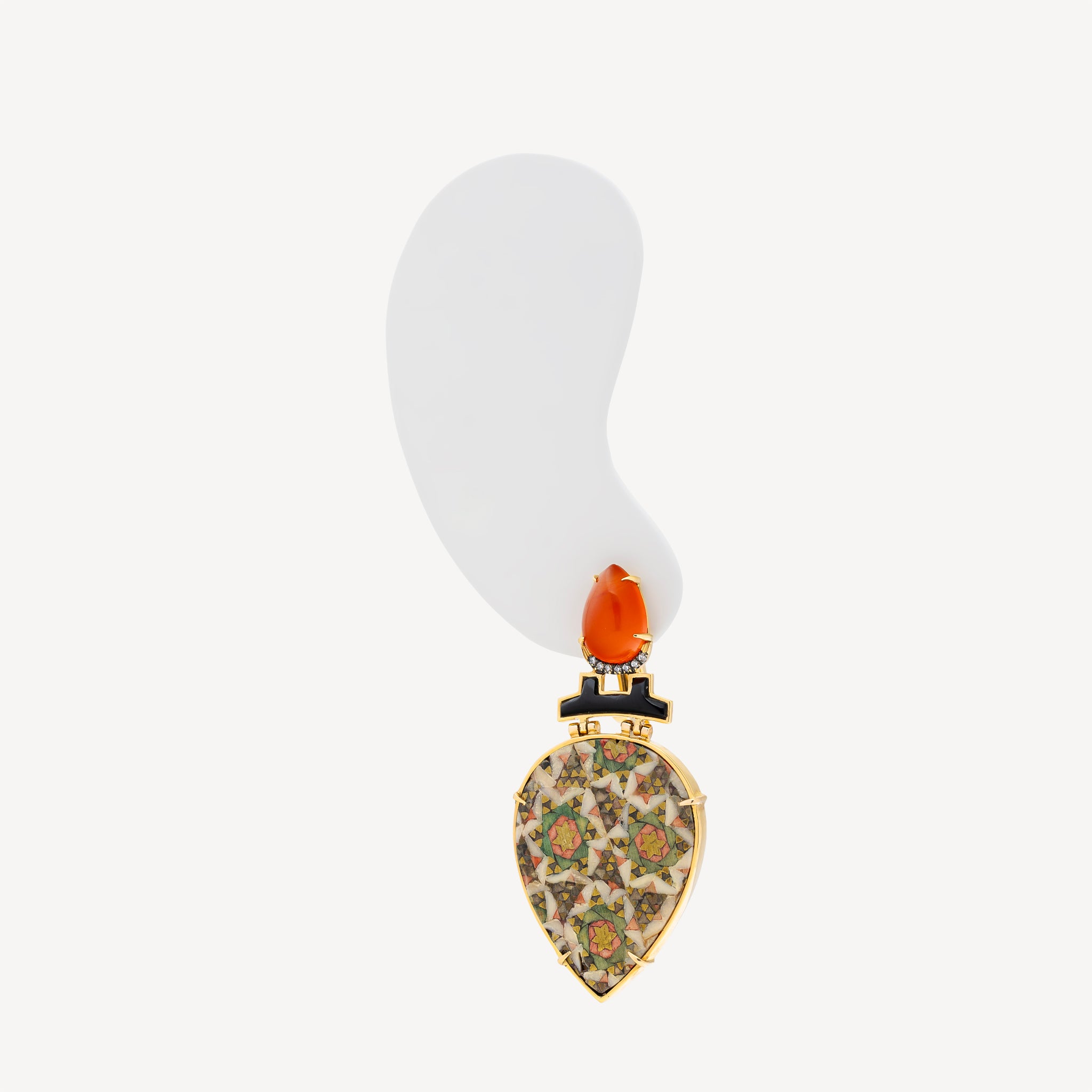 Les boucles d'oreilles Wood Star, une création singulière en or jaune, sont signées Silvia Furmanovich, maitre joaillière. Façonnées en gouttes inversées, elles allient la brillance du diamant blanc à la profondeur protectrice de l'onyx, ainsi qu'à l'énergie vivifiante de la cornaline.