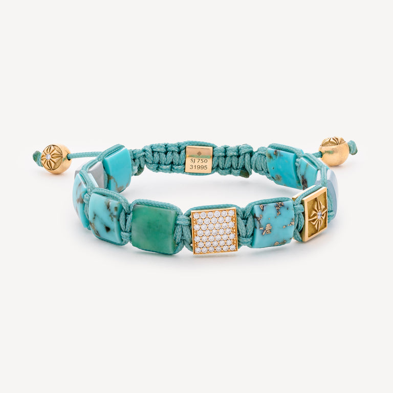 Bracelet mounted on a turquoise cord composed of : 6 turquoise locks, 2 moonstone locks, 1 emerald lock, 1 yellow gold lock adorned with 2 white diamonds, 1 yellow gold lock paved with white diamonds, 1 lock clasp adorned with a white diamond and 2 yellow gold beads adorned with 2 white diamonds.