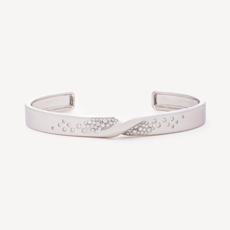 Crafted in 18-carat brushed white gold, the Fatale bracelet exudes timeless sophistication. Its sleek design is enhanced by a radiant touch of meticulously set round diamonds, creating a captivating interplay of textures and sparkle.