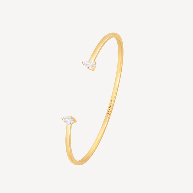 By Phoebe celebrates union with the Toi & Moi bracelet in yellow gold. Two white diamonds with complementary shapes adorn its ends: a pear-shaped stone on one side and a marquise on the other, creating a captivating visual harmony. Symbolizing purity, each diamond radiates calm.