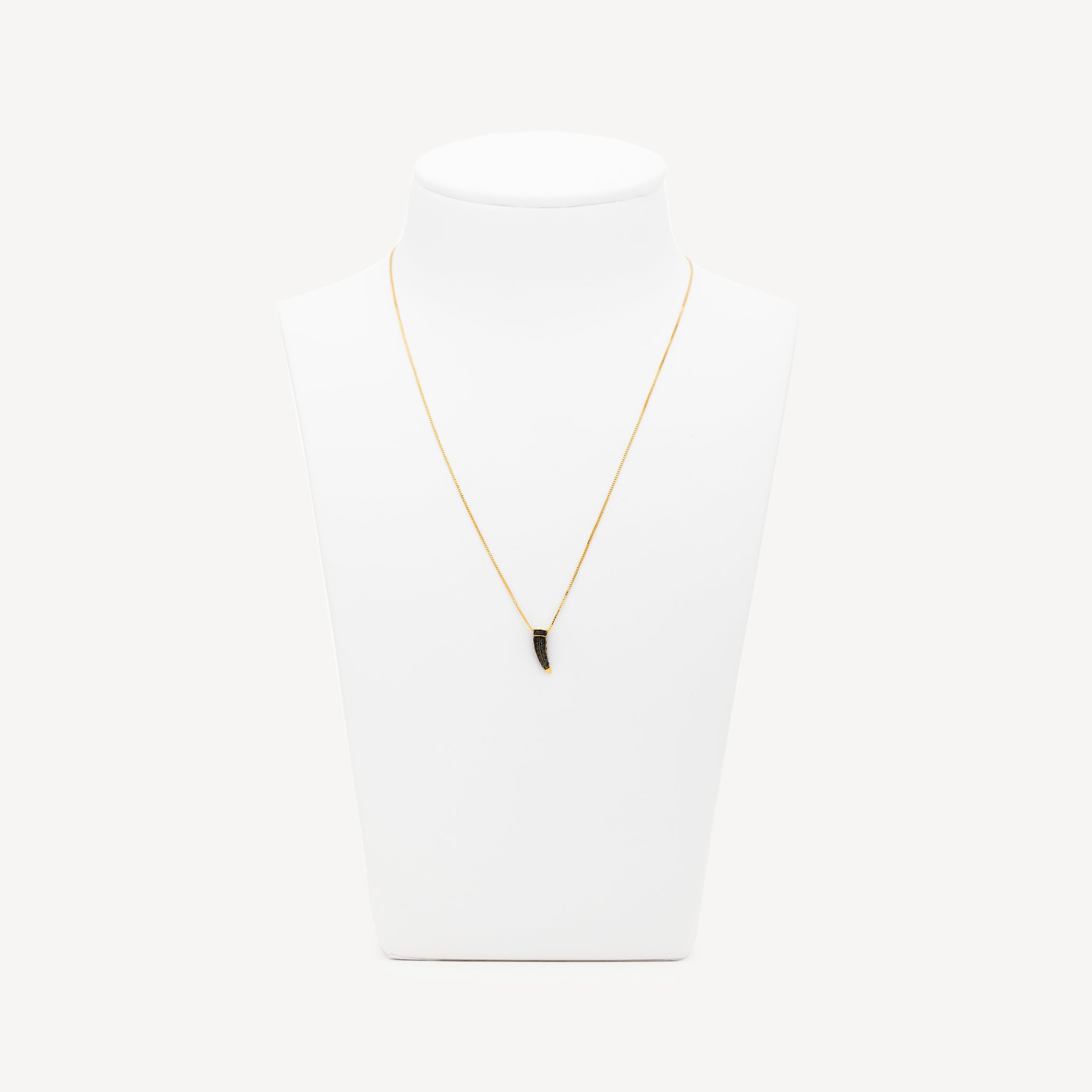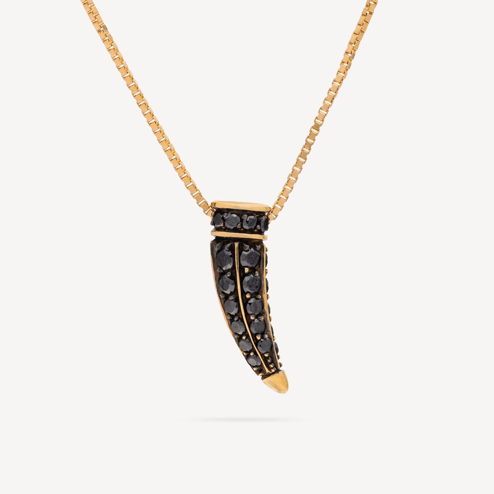 This yellow gold necklace features a horn-shaped pendant set with black diamonds. Black diamonds symbolize strength, resilience and protection.
