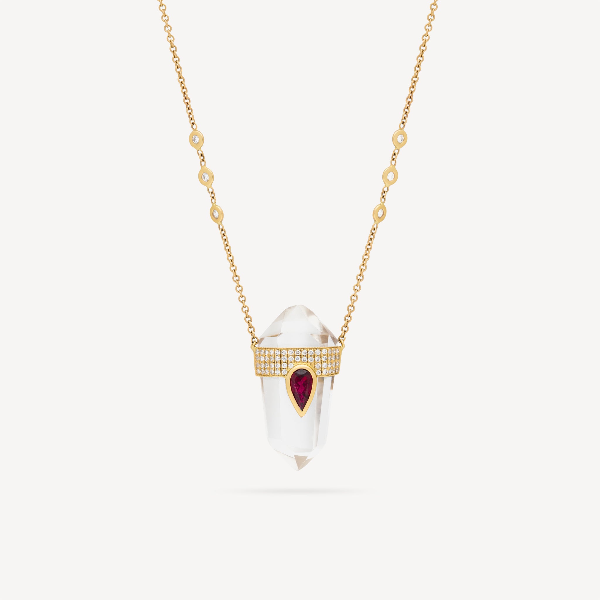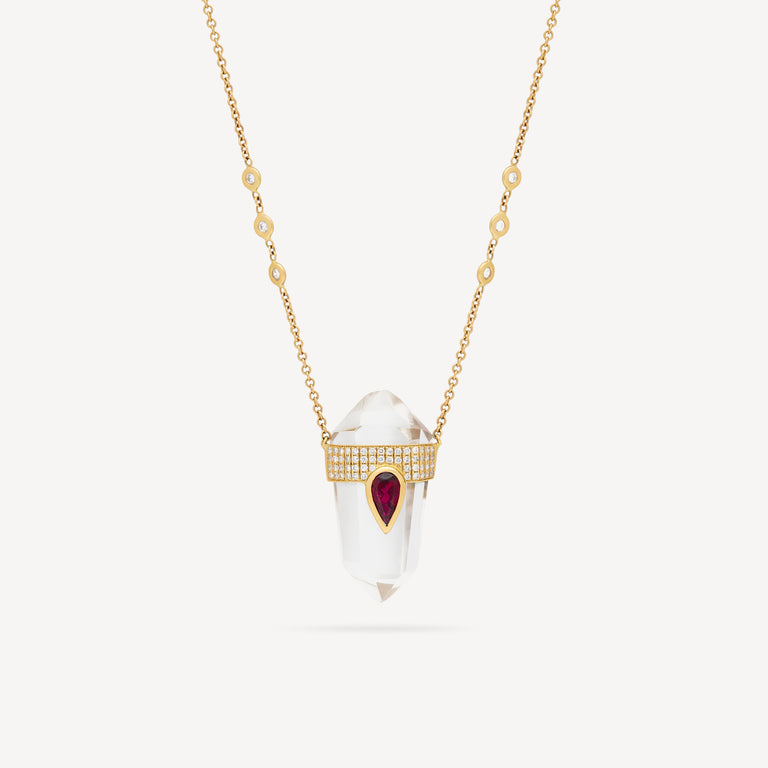 Jacquie Aiche propose le collier Tear Quartz, une création mariant la délicatesse du quartz cristallin, l'éclat des diamants et la profondeur de la tourmaline rouge sur or jaune. Le quartz amplifie les intentions et purifie les énergies, favorisant clarté mentale et harmonie vibratoire. Les diamants apportent force, pureté et rayonnement personnel. et la tourmaline rouge, pierre de vitalité et de passion, enracine l'énergie, stimule le courage et revitalise le chakra racine. Un bijou d'exception conjuguant beauté et propriétés énergétiques transformatrices.
