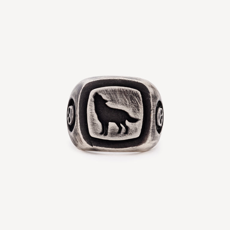 The Howling Wolf Skull ring in Silver features an engraved wolf in relief, a symbol of strength and freedom, accompanied by a skull and crossbones on the side for an authentic touch.