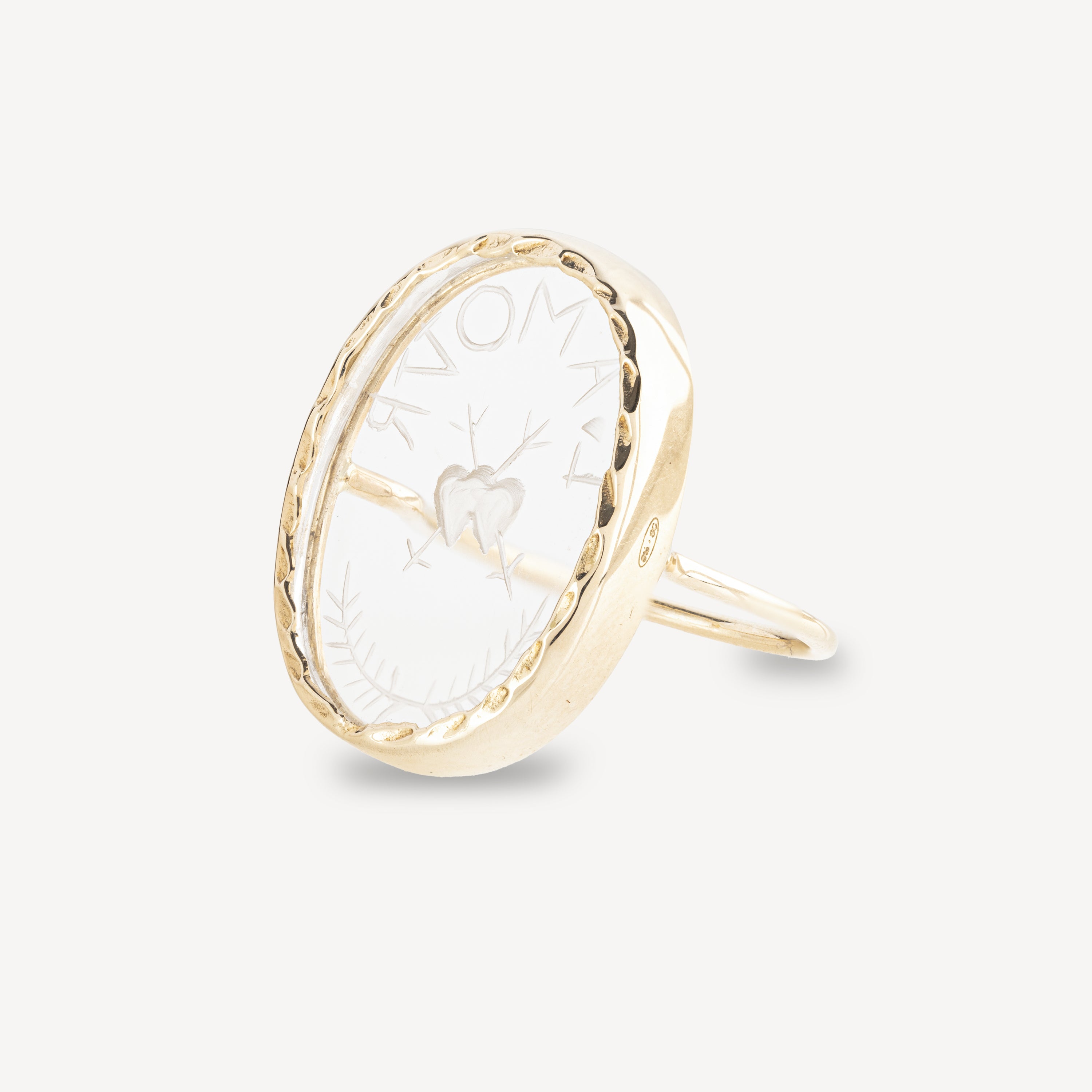 Love is engraved in crystal, alongside two hearts and foliage. A ring refined in yellow gold to reinforce all its symbols of bliss.