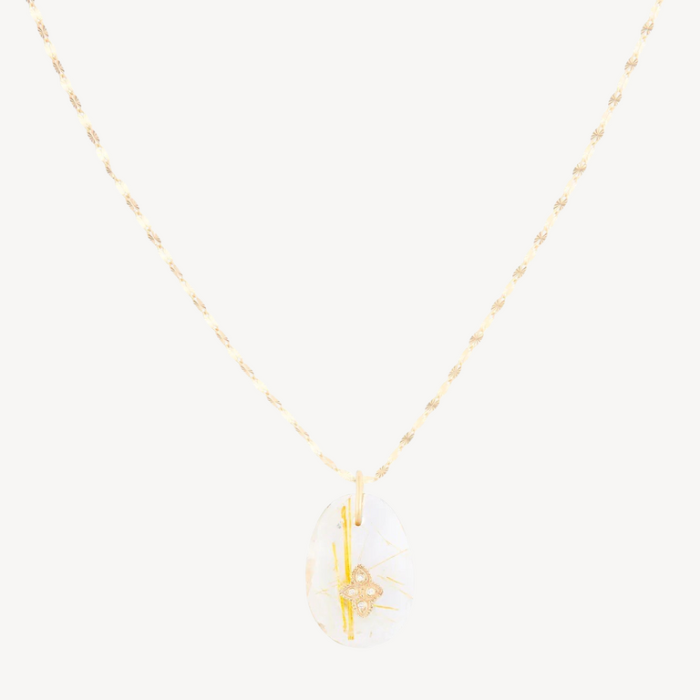 - Materials: 9K yellow gold, diamonds, rutile quartz