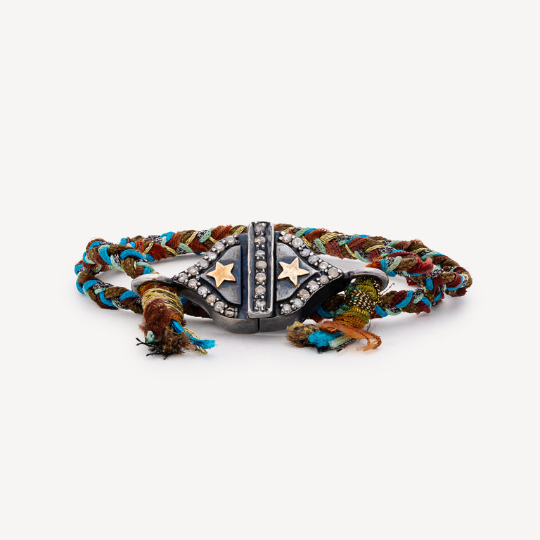 Double-turn bracelet with blue, brown, silver and gold cords, adorned with a Silver clasp decorated with white diamonds and yellow gold stars.