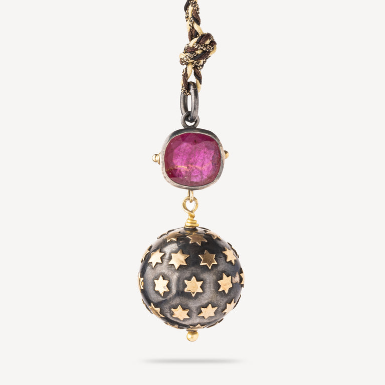This enchanting necklace evokes celestial grace with its delicately braided thread. Its "Planet Star" pendant, a sphere adorned with stars in Rose Gold, creates a constellation of captivating beauty. Suspended above, a small ruby pendant adds a touch of fiery color, adding a dazzling dimension to this ensemble of rare elegance. A celestial jewel that reveals the poetry in every detail.