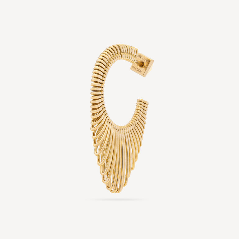 Yellow gold earring composed of mobile filiform elements of different lengths arranged in a radial pattern.