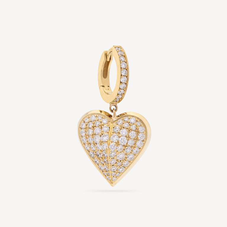 Heart-shaped dangling earring in yellow gold paved with white diamonds.