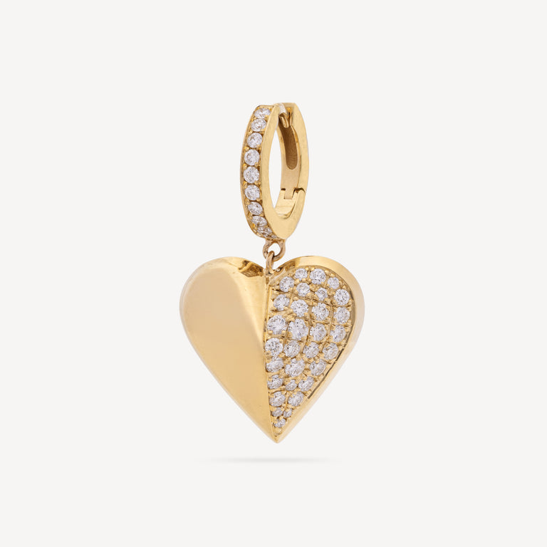 Heart-shaped yellow gold dangle earring half-paved with white diamonds.
