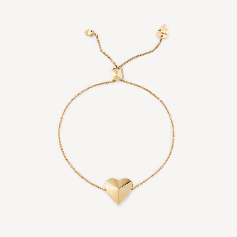 Yellow gold bracelet with central geometric heart and adjustable flat clasp.