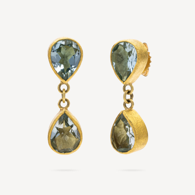 These earrings are adorned with beautiful faceted aquamarine drops, mounted on 22-carat yellow gold settings, with 18-carat gold fasteners. The stones are linked together by hoops, adding a touch of elegance to your look.