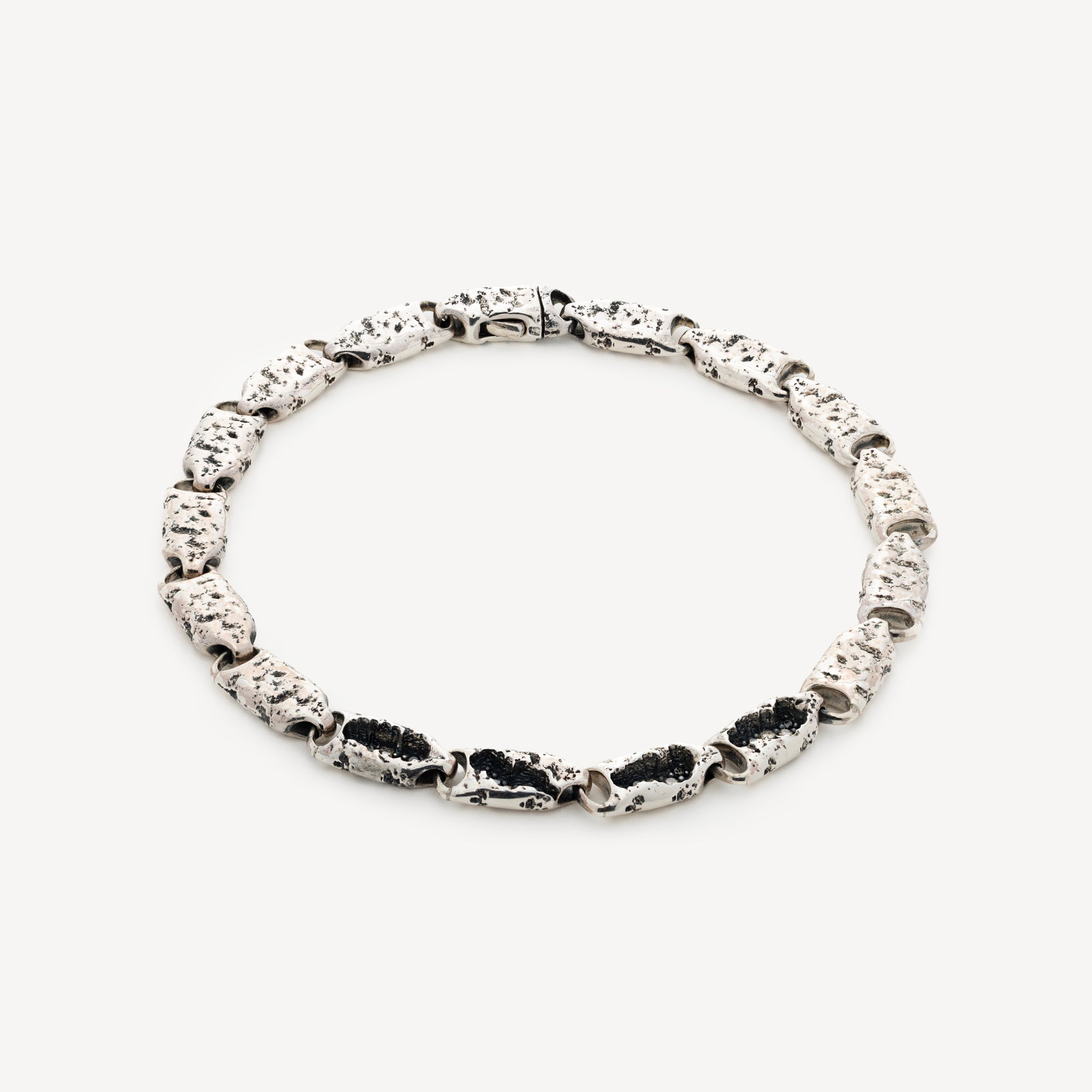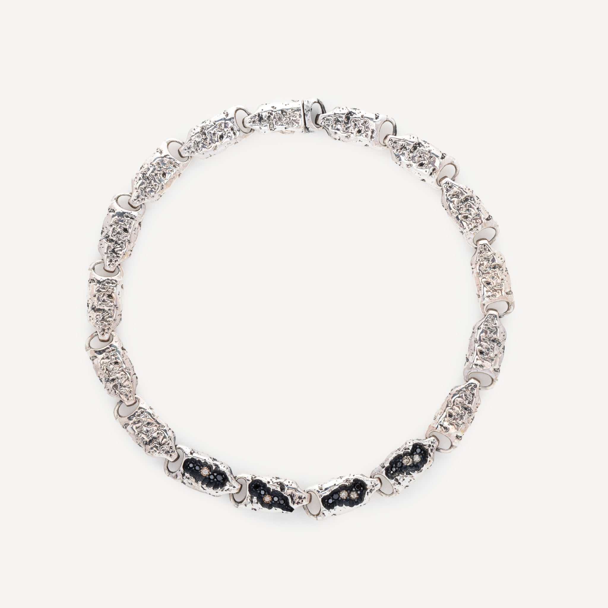 Ce bracelet Carina Hardy en argent recyclé présente des maillons plats, entrelacés et marqués par des textures minérales où scintillent des diamants noirs et bruns sertis avec précision. Doté d’un fermoir invisible, il est façonné à la main à Bali puis serti à Bangkok. Symbole de pureté et de puissance, le diamant est réputé en pour clarifier l’esprit et amplifier l’énergie.
