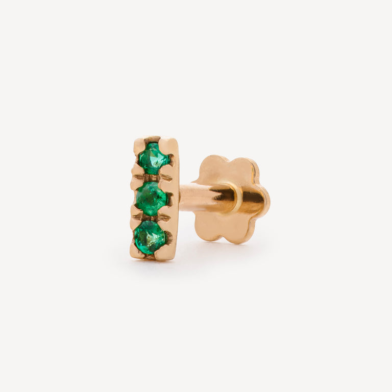 The Wild Jwls Julia piercing with three emeralds will make you feel unique, so don't let its size fool you. Made of 14-carat yellow gold with emeralds on it.